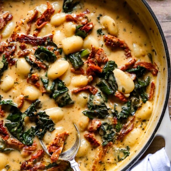 This recipe doesn't contain any meat or fish, but I don't think it really even needs any, as the pasta contains quite a bit of flavor. From the veggies, good spices of paprika, red pepper flakes, some crushed garlic andnitslian seasoning. When you top that with a Tuscan style cram sauce, I mean ...