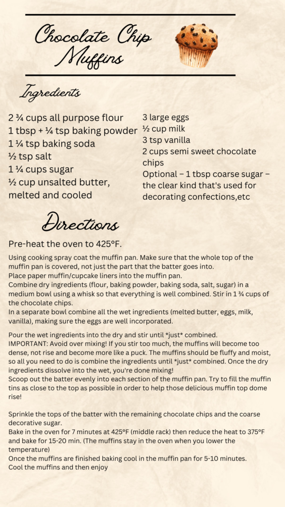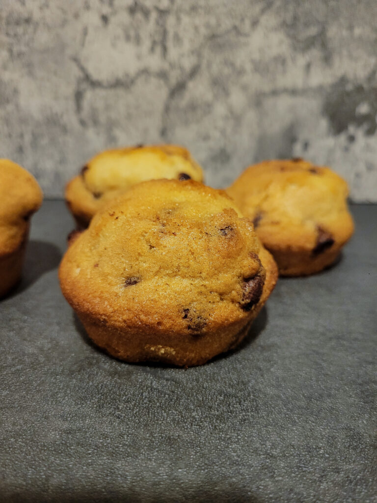 This week, we went with chocolate chip muffins. These were so good, theyre so soft and moist with the perfect amount of chocolate chips, though if your anything like me you might just end up adding in a half scoop extra of chocolate chips. My husband bought these round flat muffin tins, so our muffins came out in a half muffin, kind of like a top only muffin.These turned out to be perfect for the toddlers who cant and dont finish a whole regular muffin, and for the teen to have 2 without feeling like shes eating too much.