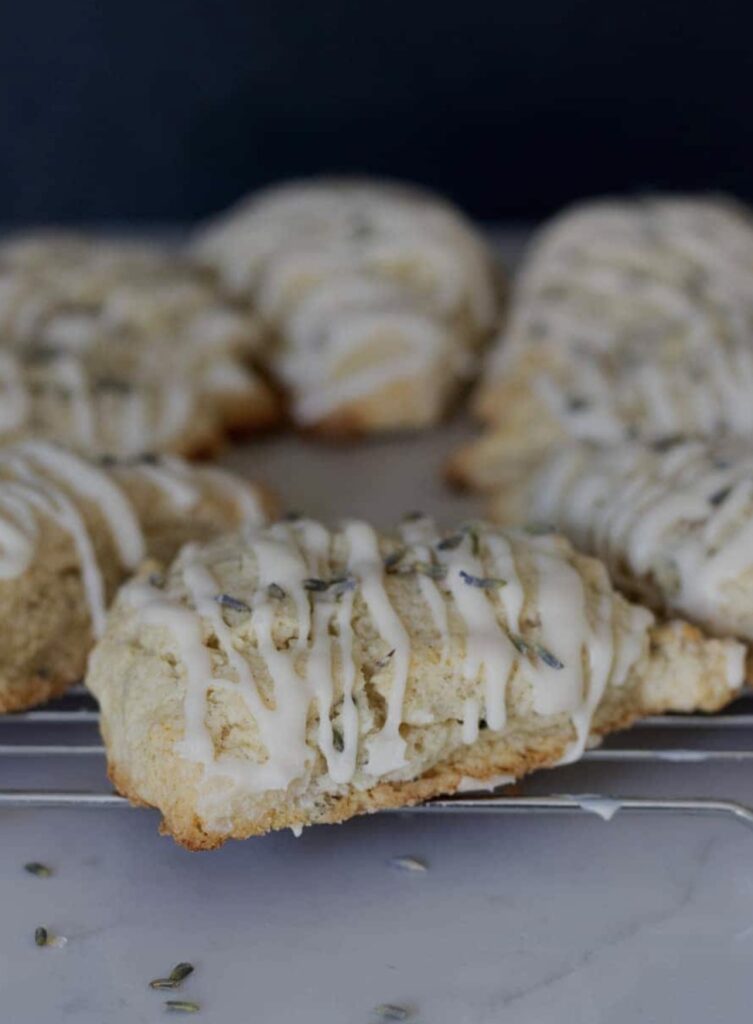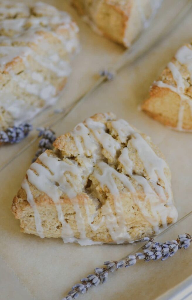 Drizzle the glaze over the cooled scones and immediately sprinkle with a small pinch of dried lavender if desired.