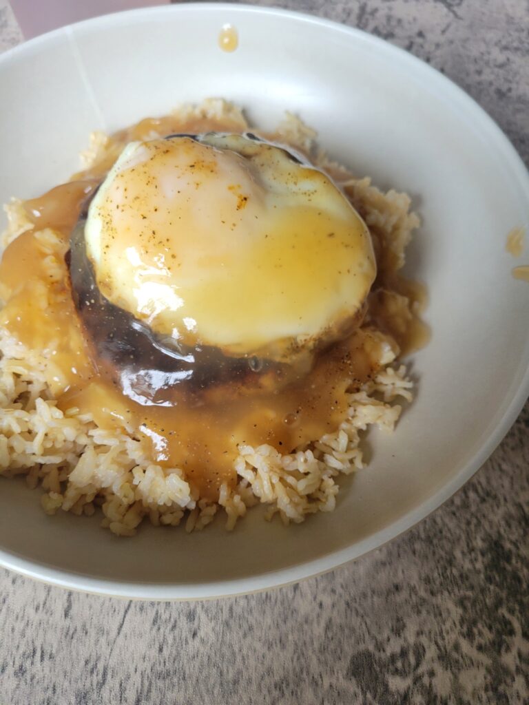 This post is about the Loco Moco recipe we used. This was very good, Chis and even the kids really liked the meal, though the kids preferred their foods to be sepoerated with the gravy on just the meat and they definitely couldn’t have an egg touching anything.