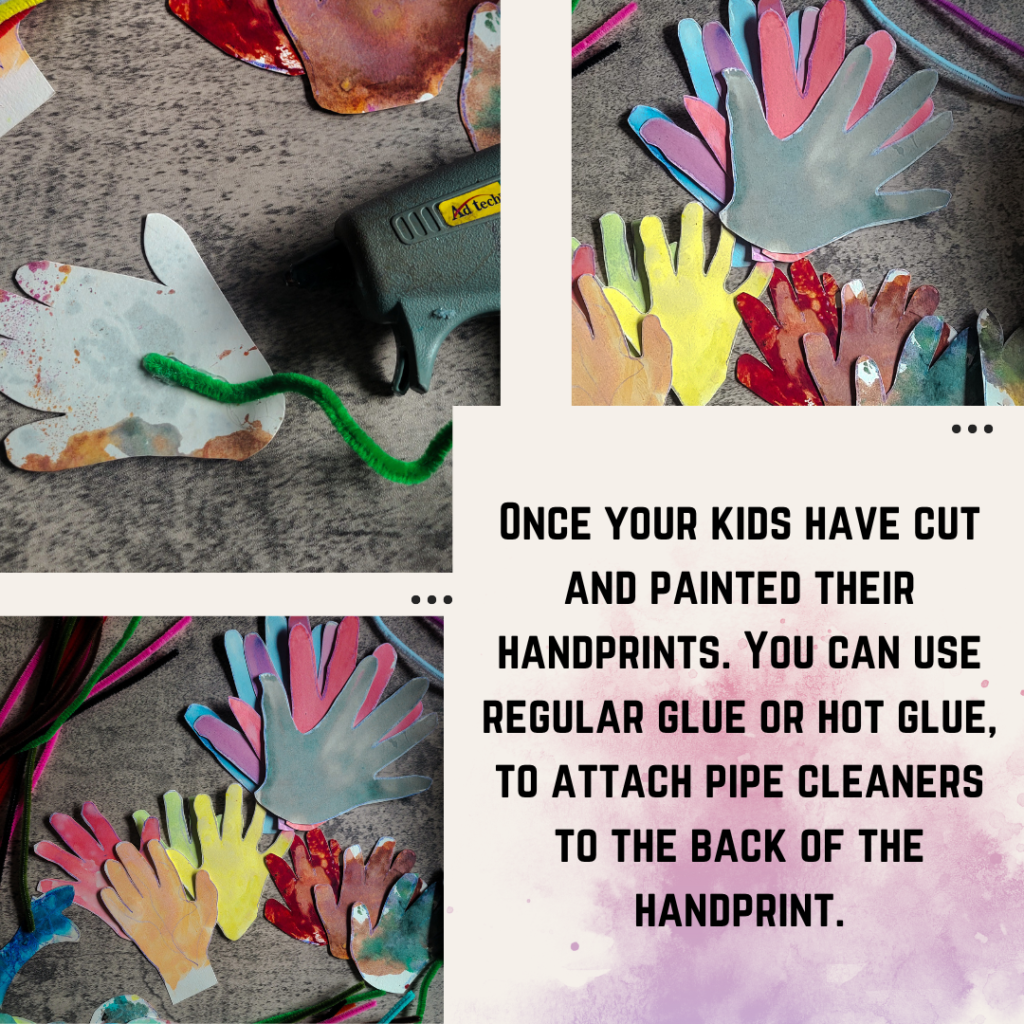 The fun and easy part of this project is that it takes watercolor paper, hot glue and pipe cleaners. All you need to do as the parent is trace their hand, cut it out and glue the pipe cleaners to the handprints before displaying them in a jar of your choice.