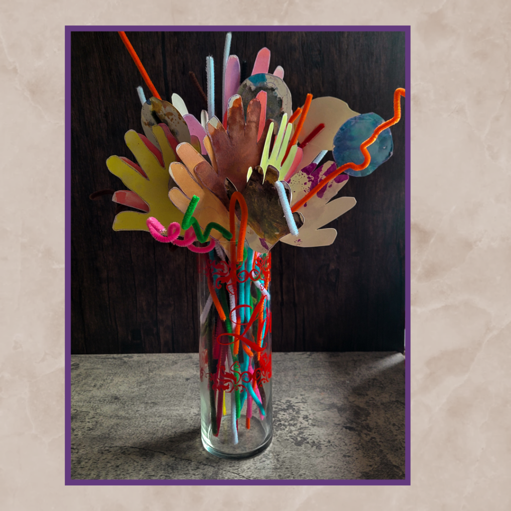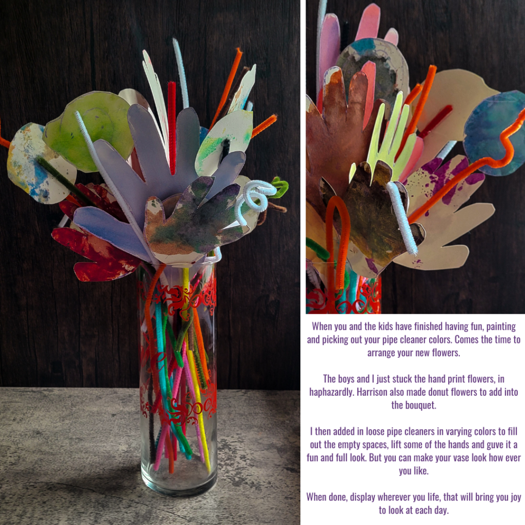 One of those projects for me, is handprint flowers. It allows me to have adorable handprints of my kids, and displayed as flowers in a lovely vase my husband bought me years ago in our early days. The project is easy and quick to do or can be done over a couple of days if needed, but they’re fun and can be displayed in any part of your home.