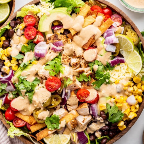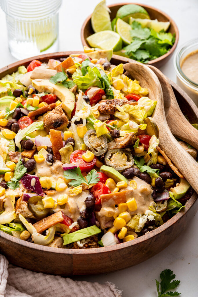 The salad is crispy and crunchy from the salad to the chips, the beans, and vegetables. That dressing gives you a little kick that’s perfect while still being smooth and creamy without any harsh spice.