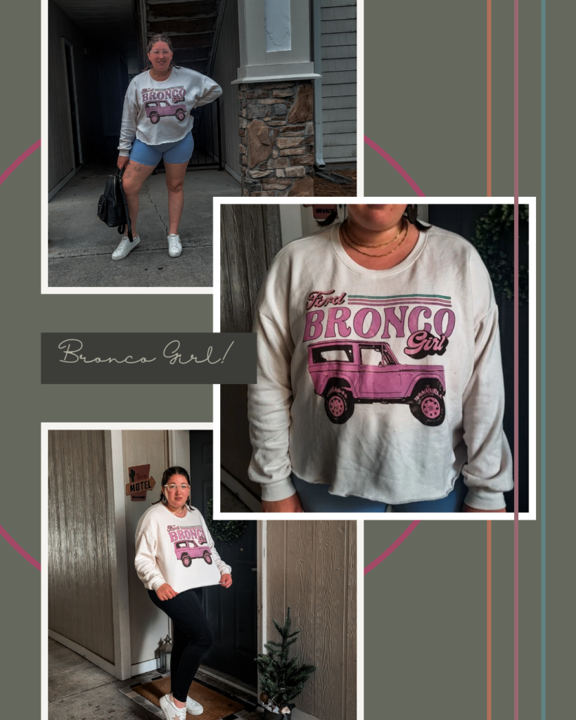 Broncos cropped sweatshirt– This one was on sale which was such a steal. I love when I can find a $20 sweatshirt for $6. Yes! This sweater cost me six bucks. While I’m not a huge fan of the girl in the sweatshirt and would have like just bronco, it’s still really cute. I love the fuzziness on the inside, the long sleeves and it’s cropped at a good length for me. I chose a size xl in this.