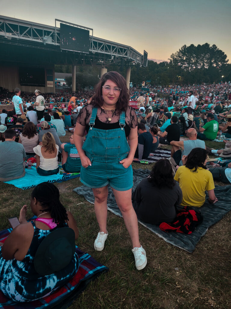 I am wearing an xl this overall, while it is a little tight around the middle of my stomach, it wasn’t too much that I was uncomfortable. I wore this for eight hours at the concert, getting up and down, and laying on our blanket at our spot on the lawn. It was annoying to take off when needing to use the restroom because I was sweaty but the side buttons come off making it easier to put on and remove.